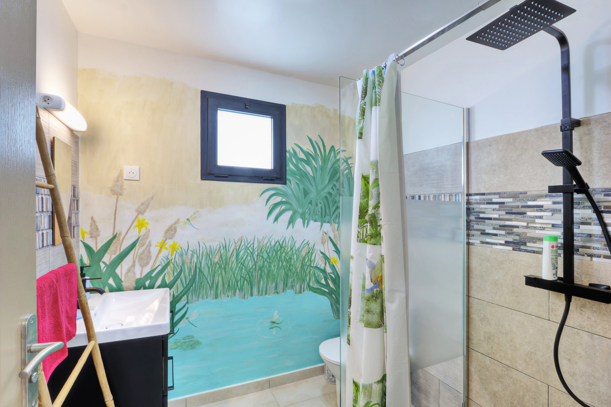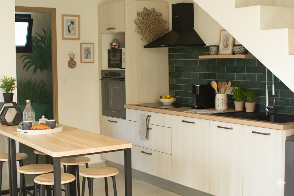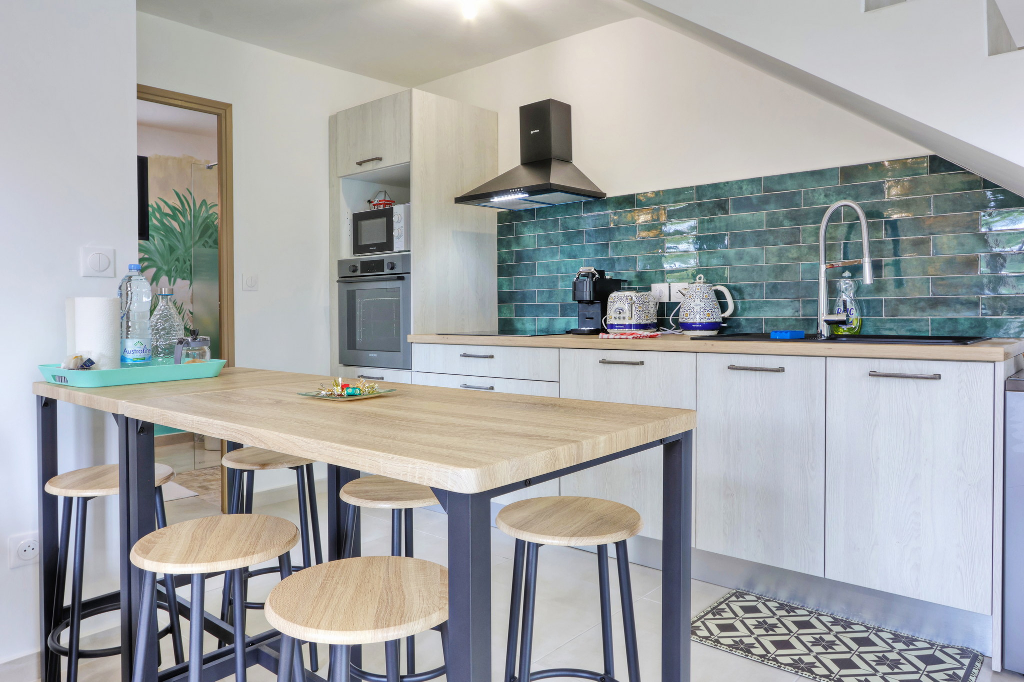 Entièrement équipée pour préparer vos repas comme à la maison, cette cuisine moderne et fonctionnelle dispose de tout le nécessaire : four, plaques de cuisson, réfrigérateur, et ustensiles complets. L'espace ouvert favorise les moments de partage et vous permet de cuisiner tout en profitant de la compagnie de vos proches.