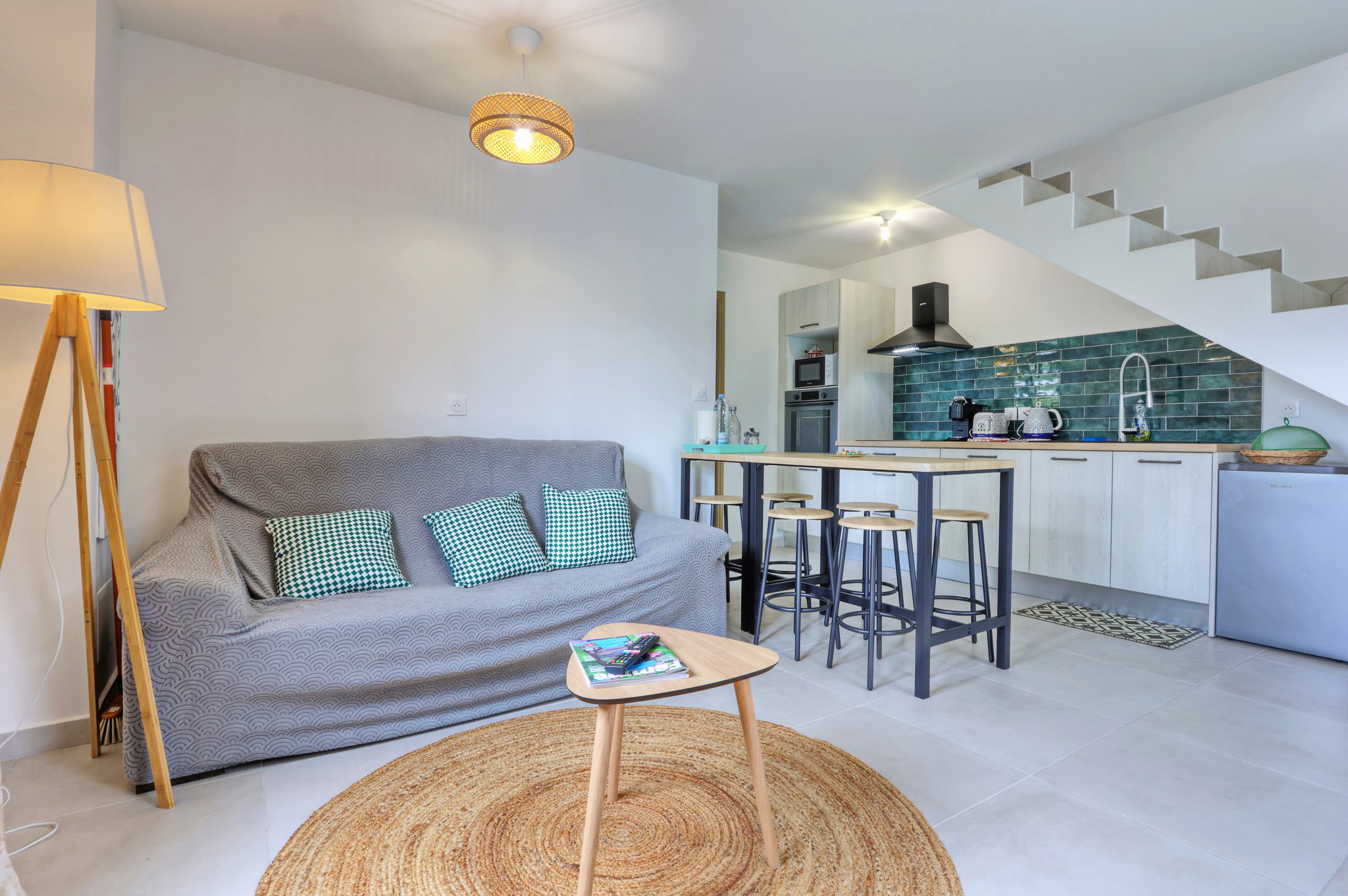 Un espace de vie lumineux et convivial où se retrouver après une journée d'exploration. Grand canapé confortable, lumière naturelle généreuse grâce aux larges baies vitrées, et une décoration contemporaine aux tons apaisants créent une atmosphère chaleureuse pour vos moments de détente en famille.